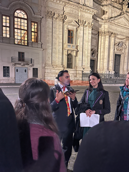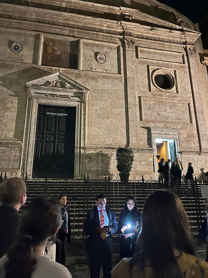 This year once again, John and Ashley led a church walk with special scriptural and poetic reflections. This TBP event began with the Mass of the Lord's Supper at the Venerable English College. From there we made our way to the candle-and flower-bedecked altars of Santissima Trinitá, Saint Brigid of Sweden, Sant'Agnese in Piazza Navona, Sant'Appolinare, and finally to the basilica of St. Augustine, where the chapel of his mother, St. Monica, was set up as the altar of repose.